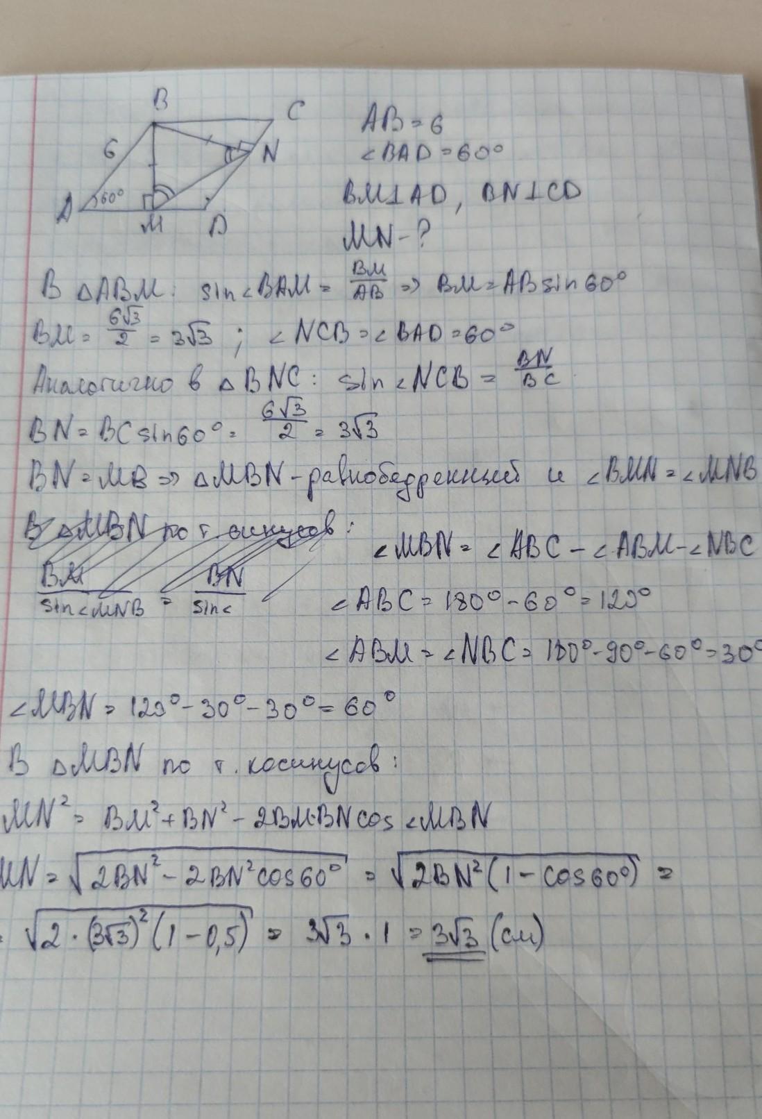 Либо вместо теоремы косинусов можно доказать тот факт, что треугольник BMN равносторонний, найдя все его углы. Таким образом, BM = MN =