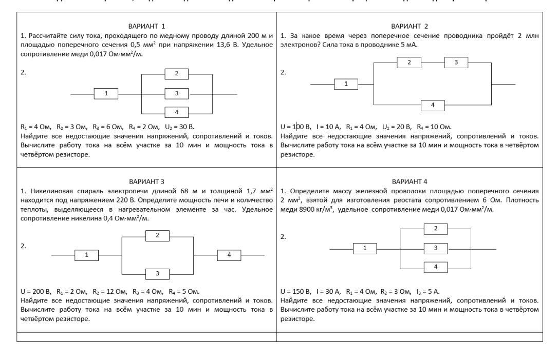 R1 = 4 Ом, R2 = 3 Ом, R3 = 6 Ом, R4 = 2 Ом, U2 = 30 В. Найдите все недостающие значения напряжений, сопротивлений и токов. Вычислите работу тока на всём участке за 10 мин и мощность тока в четвёртом резисторе. первый вариант 2 задание