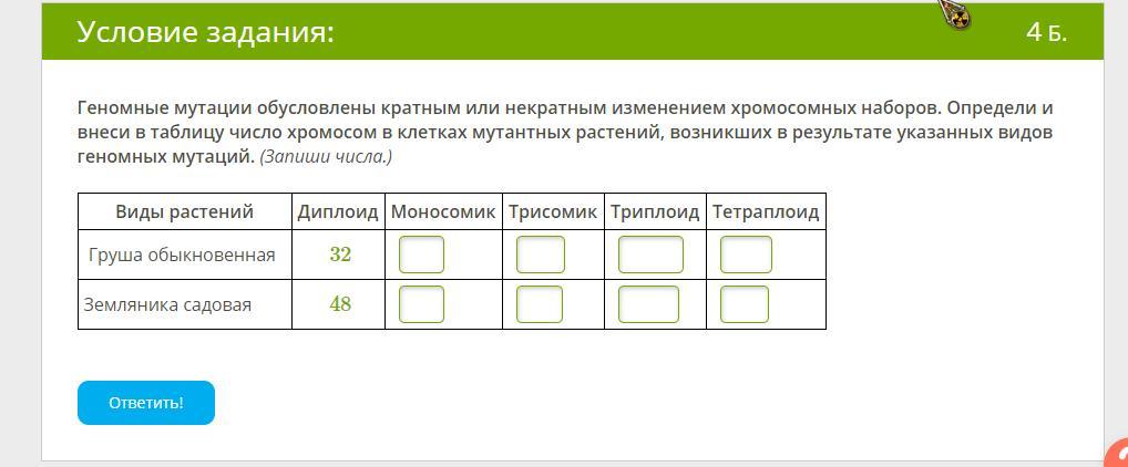 Геномные мутации обусловлены кратным или некратным изменением хромосомных наборов. Определи и внеси в таблицу число хромосом в клетках мутантных растений, возникших в результате указанных видов геномных мутаций. (Запиши числа.)