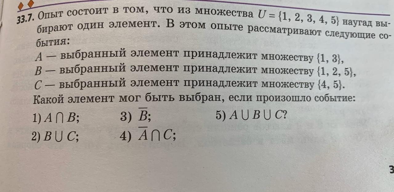 Опыт состоит в том, что из множества U= {1,2,3,4,5} наугад выбирают один элемент. В этом опыте рассматривают следующие события: (продолжение в фото)