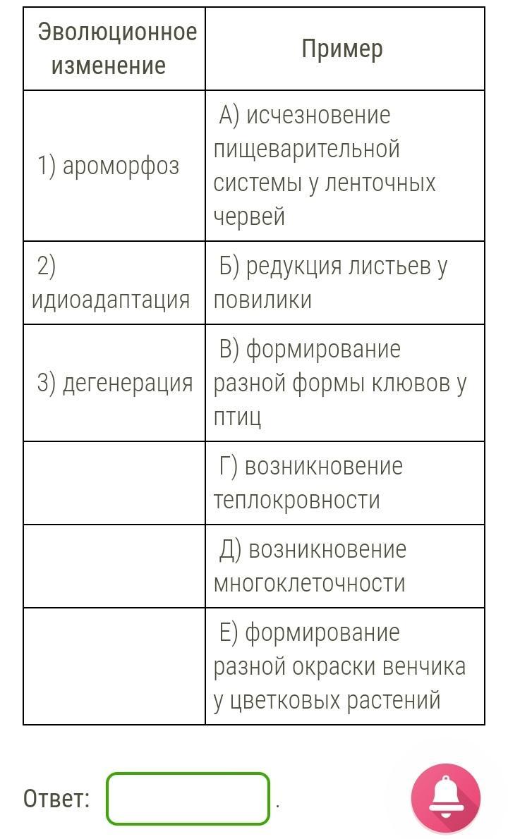 Установи соответствие между эволюционными изменениями и их примерами. (Ответ запиши в виде сочетания цифр и букв. Буквы записывай в алфавитном порядке. Пример: 1АБ2ВЕ3ГД.)