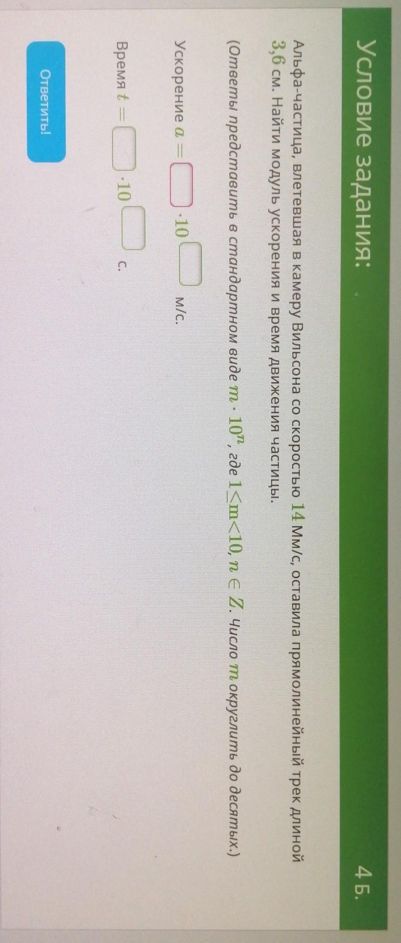 Альфа-частица, вылетевшая в камеру Вильсона со скоростью 14 мм/с, оставила прямолинейный трек длиной в 3,6 см. Найти модуль ускорения и время движения частицы.