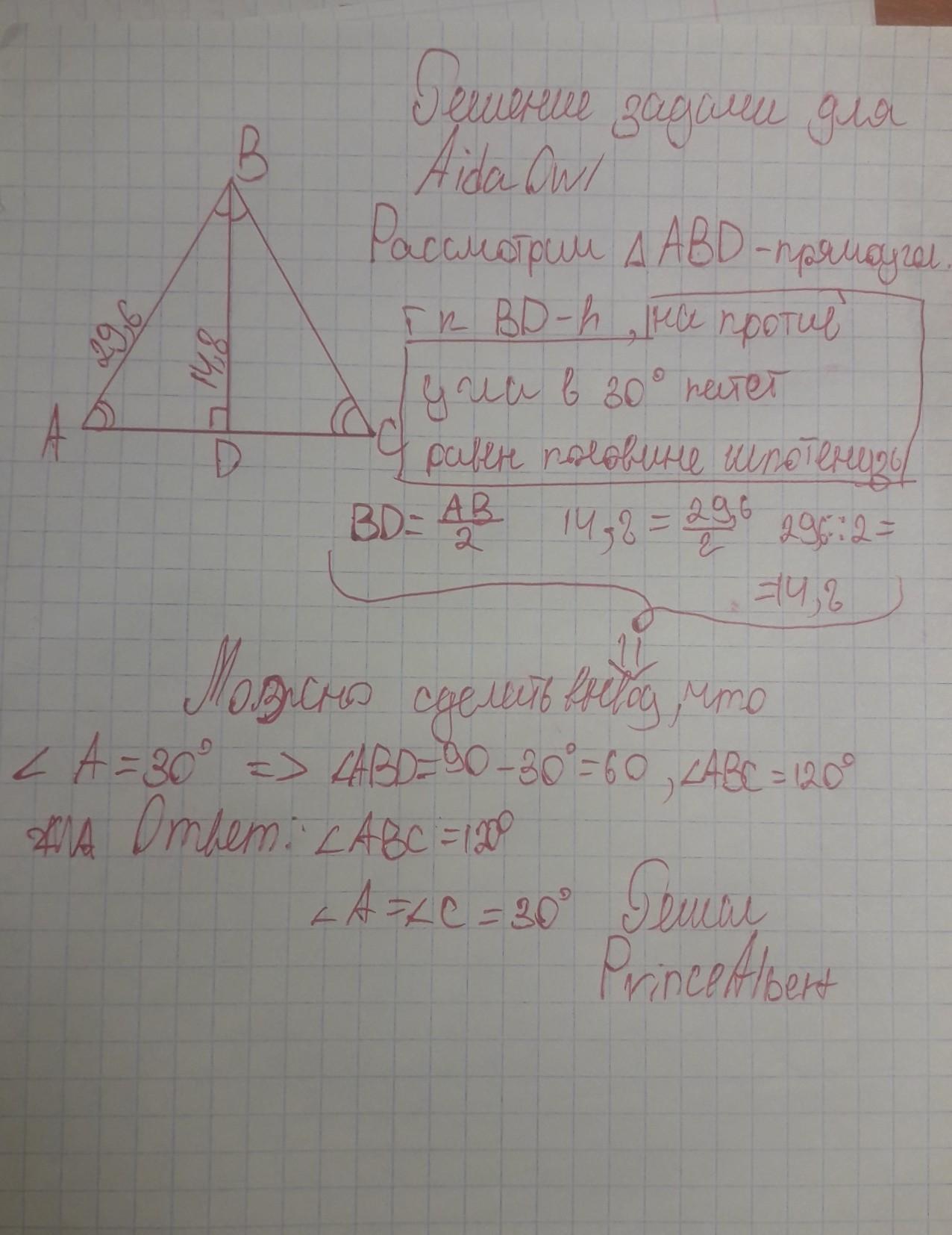 в равнобедренном треугольнике ABC проведена высота BD к основанию АС длина высоты 14,8 см длина боковой стороны 29,6 см Определите углы этого треугольника