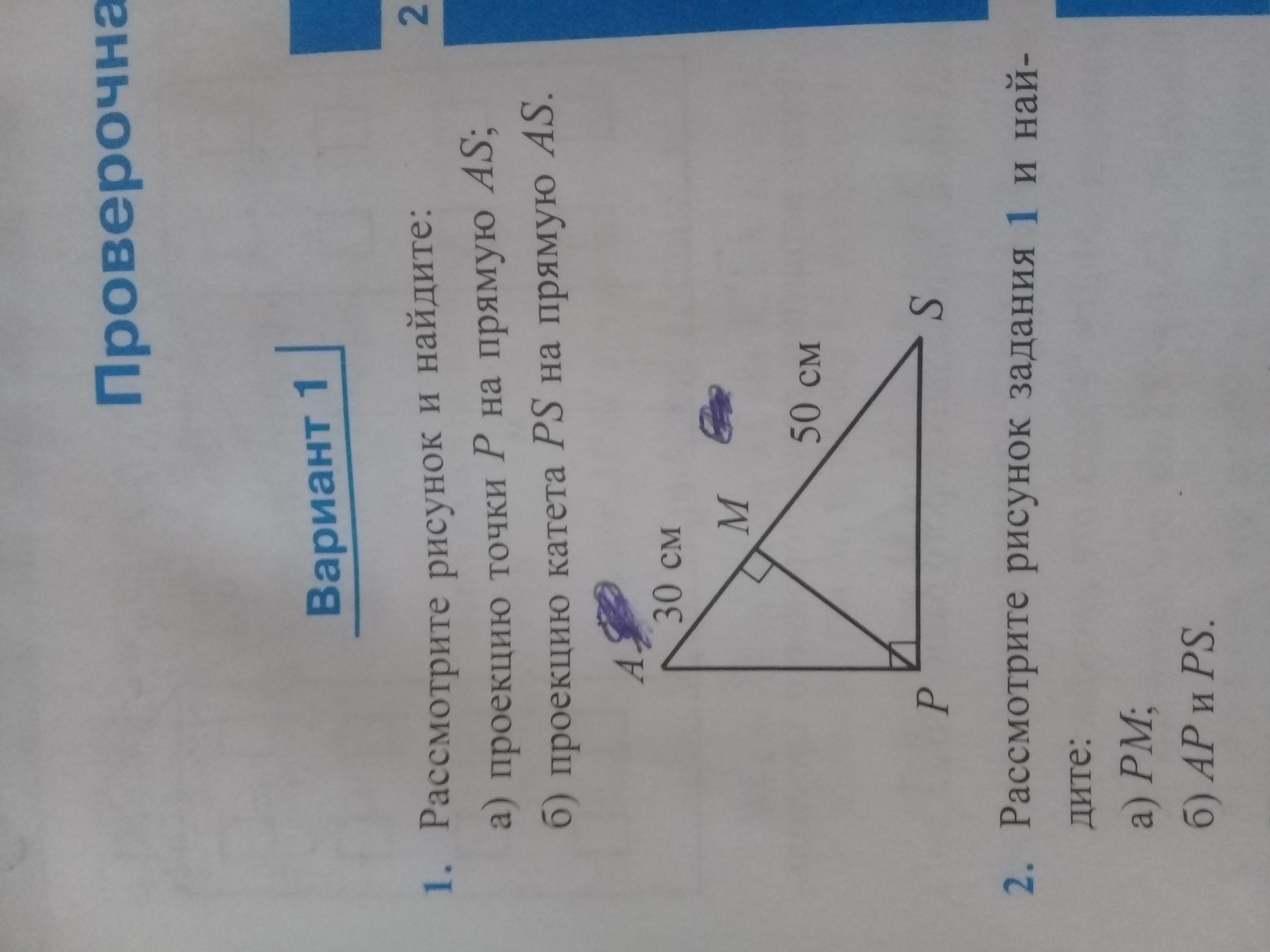 Пойдем по правилу: катет лежащий напротив угла в 30° равен половине гипотенузы. По чертежу, а если искать, то и по правилу ( сумма острых углов треугольника равна 90°), понятно, что угол АРМ равен 30°. Тогда идём по первому правилу и выйдем на то, что АР= 30×2= 60см. Теперь в силу вступает ещё одно правило( дам сразу в буквенном эквиваленте): РМ= АР-АМ= 60-30= 30см. По этому же правилу найдем PS. PS= РМ+МS= 30+50=80см.