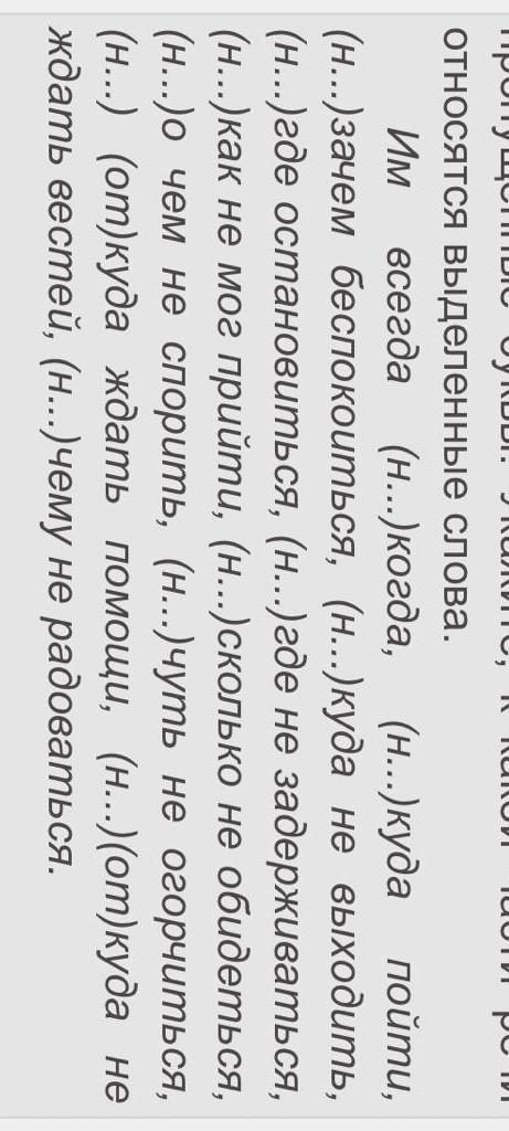 Им всегда НЕкогда (наречие), НЕкуда (наречие) пойти, НЕзачем (наречие) беспокоиться, НИкуда (наречие) не выходить, НЕгде (наречие) остановиться, НИгде (наречие) не задерживаться, НИкак (наречие) не мог прийти, НИсколько (наречие) не обидеться, НИ (частица) о чём не спорить, НИчуть (наречие) не огорчиться, НЕоткуда (наречие) ждать помощи, НИоткуда (наречие) не ждать вестей, НИчему (местоимение) не радоваться.