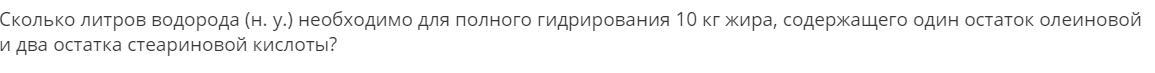 Сколько литров водорода (н. у.) необходимо для полного гидрирования 10 кг жира, содержащего один остаток олеиновой и два остатка стеариновой кислоты?