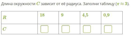 Длина окружности C зависит от её радиуса. Заполни таблицу (π≈3).