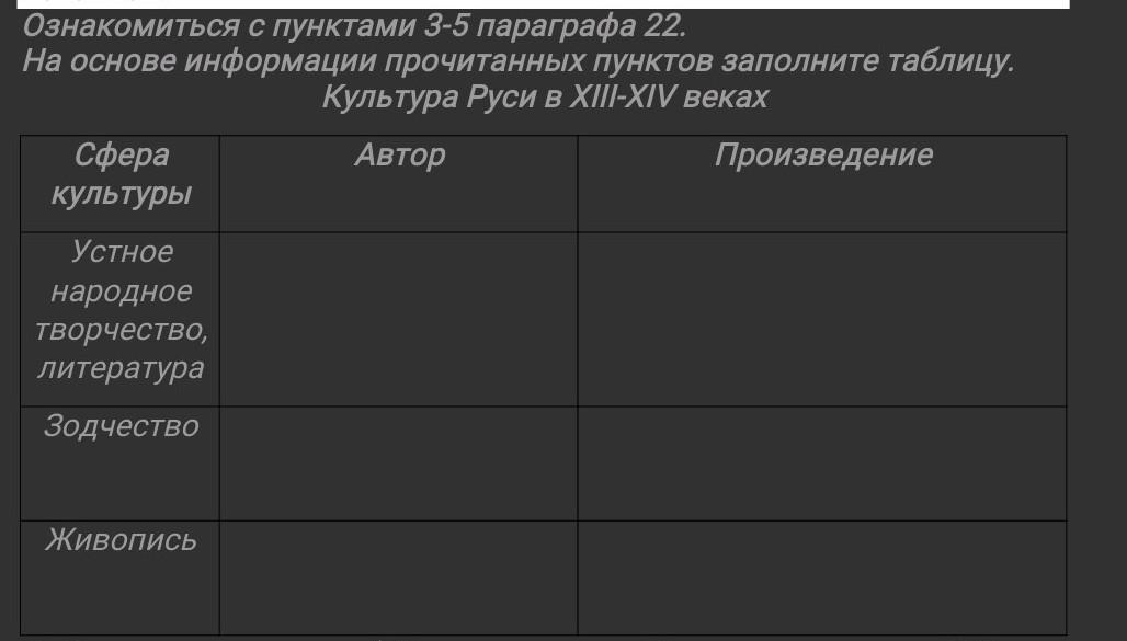 Помогите пожалуйста,просто умоляю вас очень надо. Нужно заполнить таблицу Культура Руси в 13-14 веках. Даю 40 баллов!