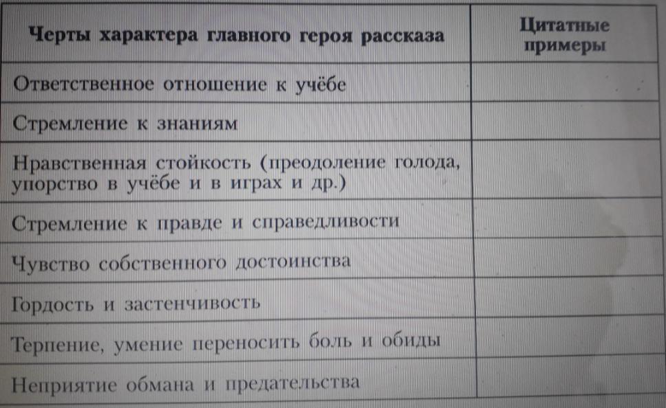 Составить цитату таблицу "Черты характера главного героя рассказа"