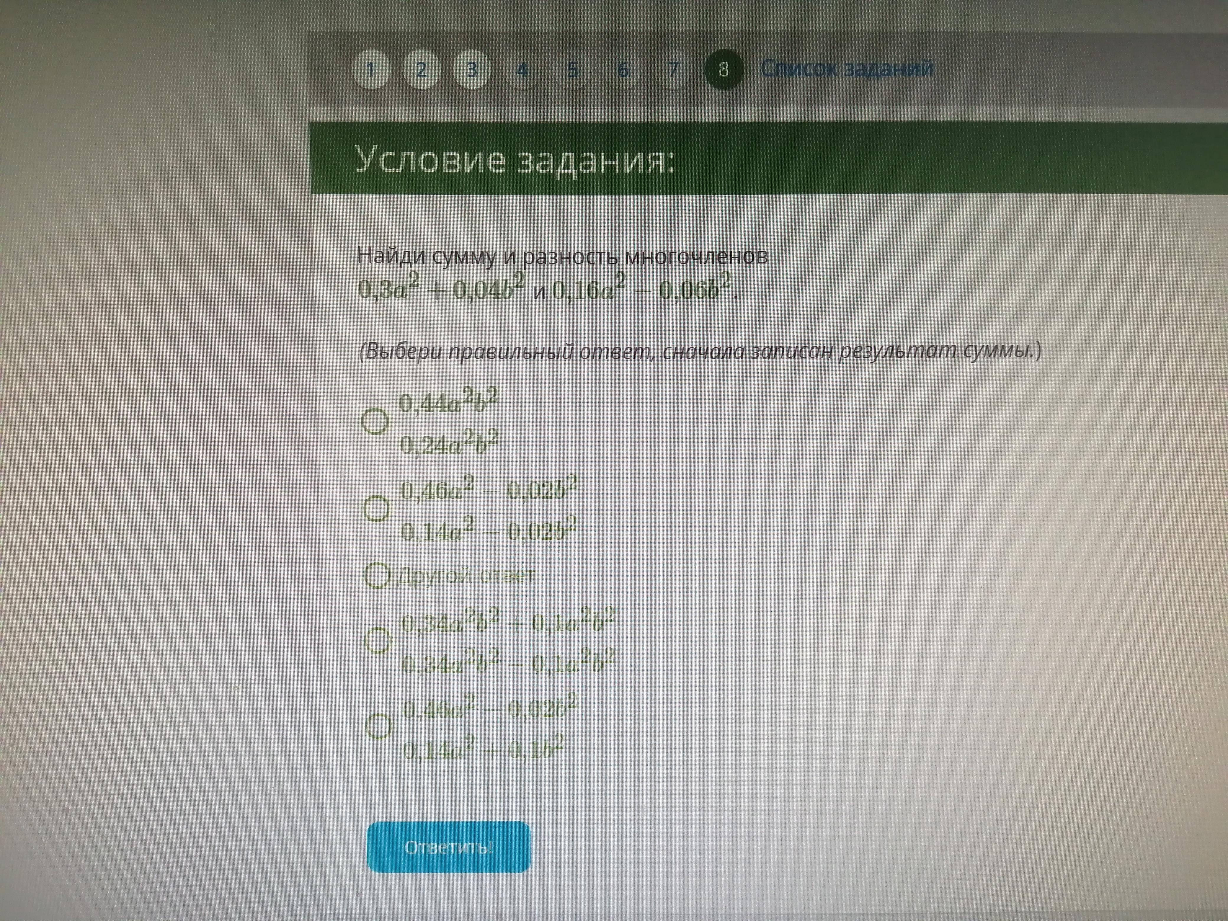 0.3a^2 + 0.04b^2 - (0.16a^1-0.06b^2) = 0.3a^2 + 0.04b^2 - 0.16a^1+0.06b^2=