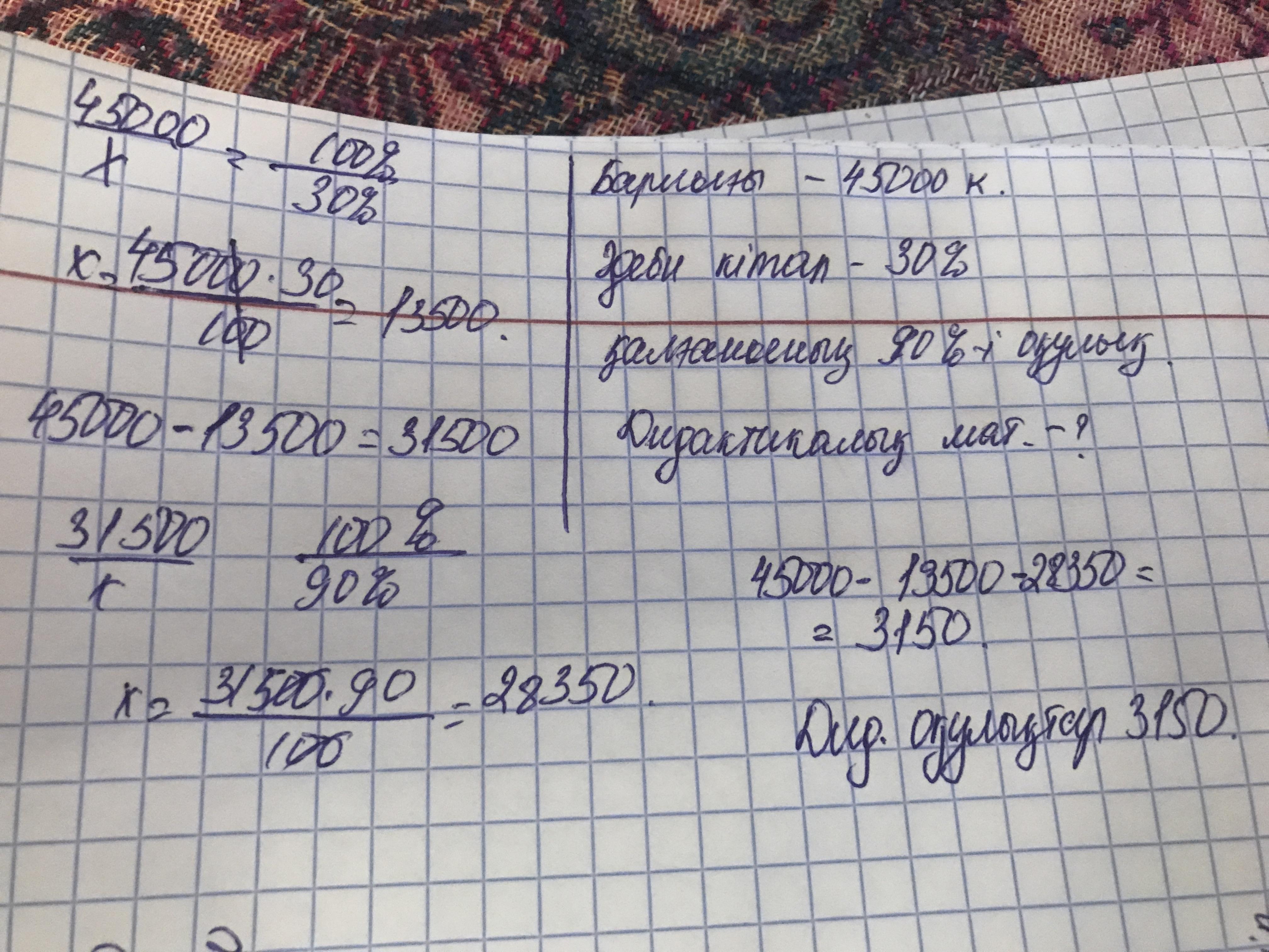 Кітапханадағы барлық 45000 кітаптың 30%-әдеби кітаптар, ал қалғанның 90%-ті оқулықтар. Ал қалғаны дидактикалық материалдар болса, дидактикалық материалдар қанша кітап?