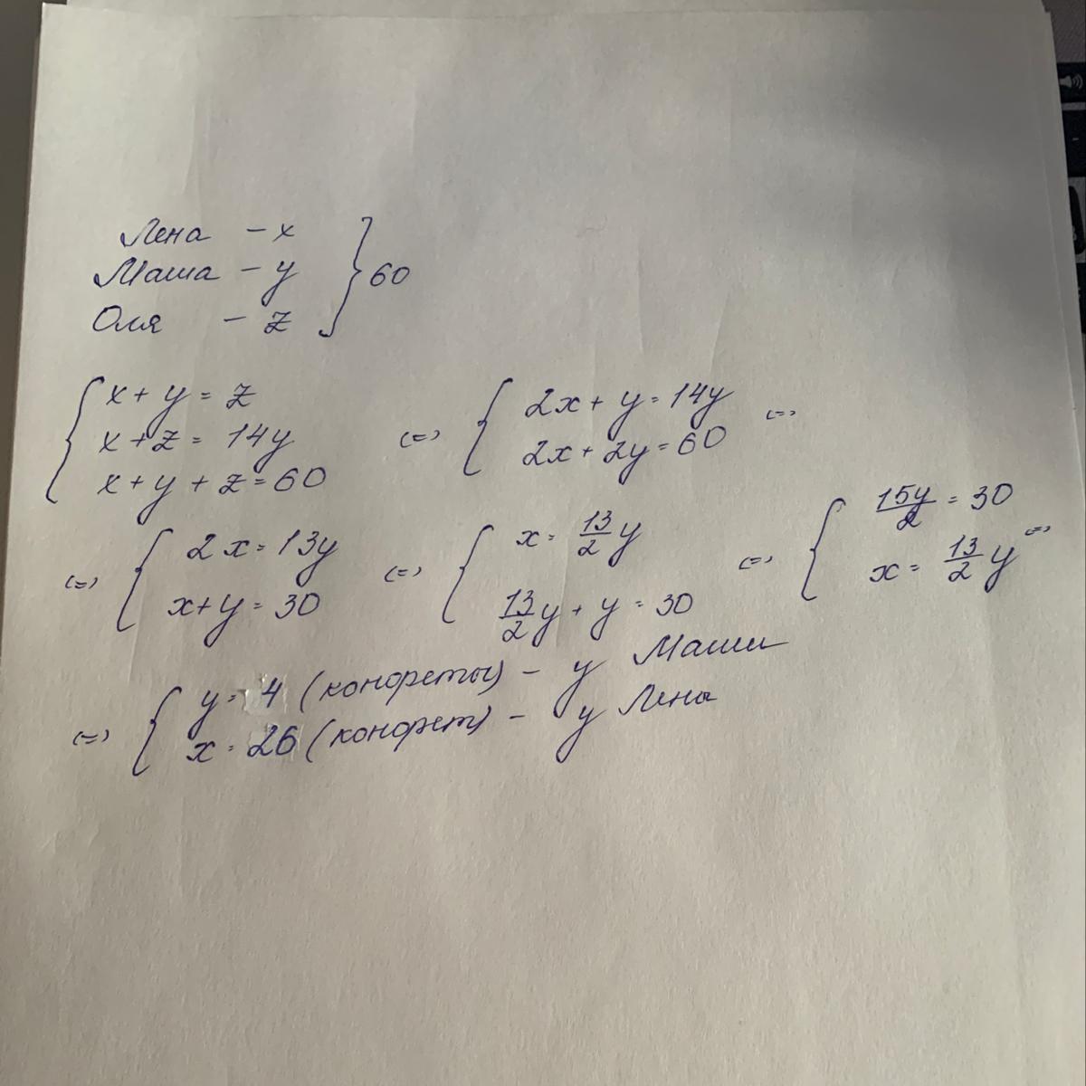 Лена,Маша и Оля разделили между собой 60 конфет,Лена заметила,если она отдаст все конфеты Маше,то у Маши и Оли станет станет поровну конфет,а если она отдаст все свои конфеты Оле,то у Оли станет в 14 больше конфет,чему Маши.Сколько конфет было у Лены?