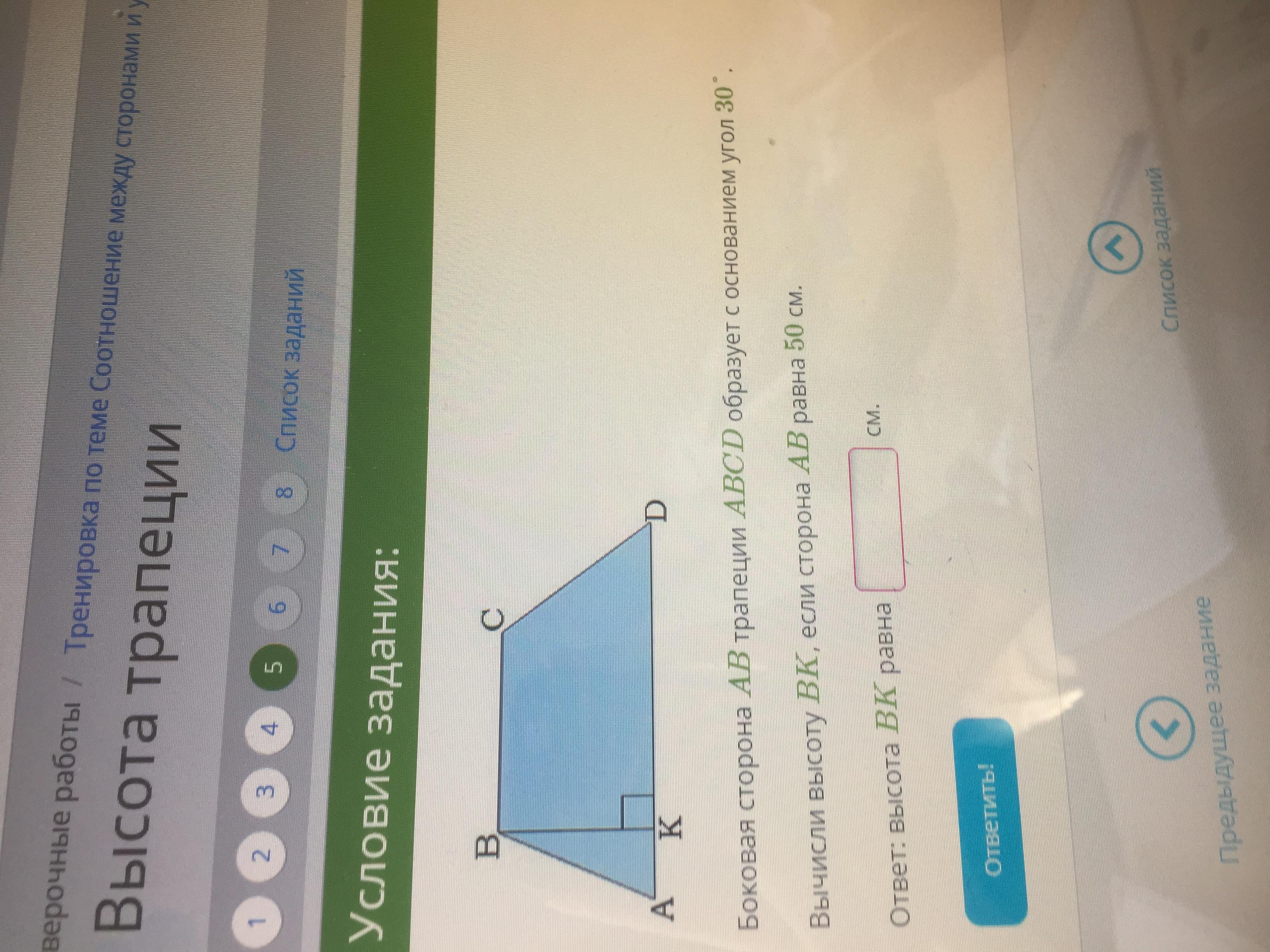 Боковая сторона АВ трапеции АВСD образует с основанием угол 30 градусов . Вычислите высоту BK , если сторона АВ =50 см . Ответ : высота BK равна ? См