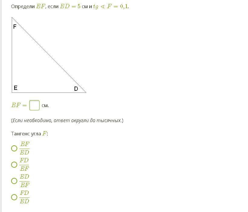 Определи EF, если ED= 5 см и tg∢F=0,1.