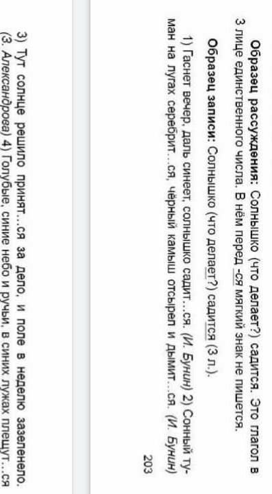 вечер (что делает?) гаснет, даль (что делает?) синеет, солнышко (что делает?) садится - перед ся юмягкий знак не пишется, сонный туман на лугах серебрится - туман (что делает?) серебрится, перед ся мягкий знак не пишется, чёрный камыш отсырел и дымится - камыш (что сделал?) отсырел, камыш (что делает?) дымится, перед ся мягкий знак не пишется, тут солнце решило приняться за дело - солнце (что сделало?) решило, и поле в неделю зазеленело - поле (что сделало?) зазеленело, голубые, синие небо и ручьи, в синих лужах плещутся - небо и ручьи (что делают?) плещутся, перед ся мягкий знак не пишется