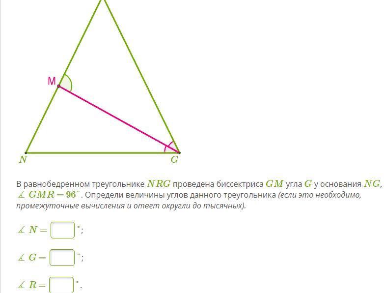 В равнобедренном треугольнике NRG проведена биссектриса GM угла G у основания NG,