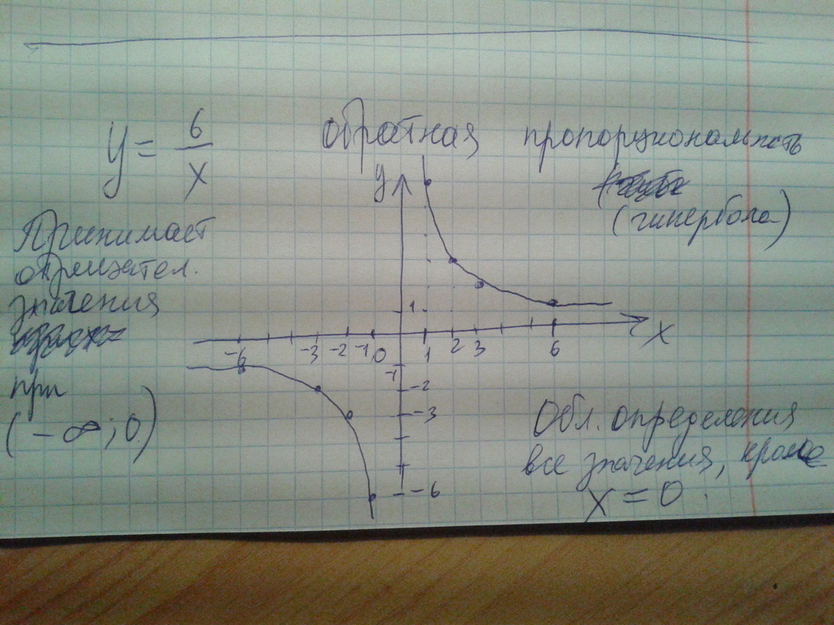 Постройте график функции y=6/x.какова область определения функции?При каких значениях x функция принимает отрицательные значения?