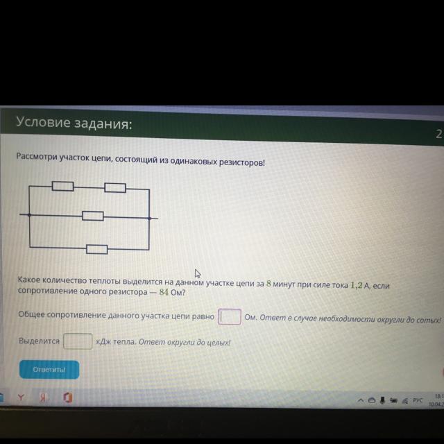 Какое количество теплоты выделится на данном участке цепи за 8 минут при силе тока 1,2 А если сопротивление одного резистора 84 Ом
