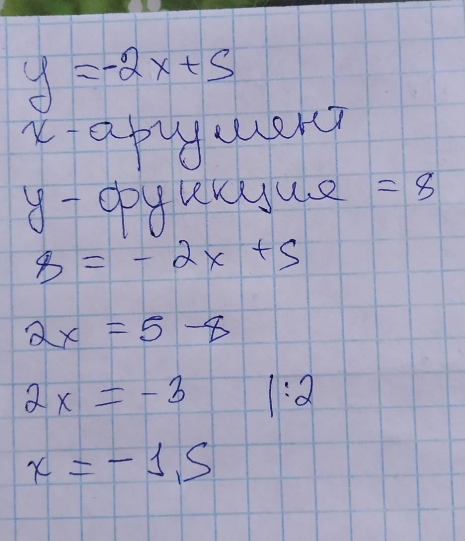 Функция задана формулой у=-2х+5. Найти значение аргумента , при котором значение функции равно 8.