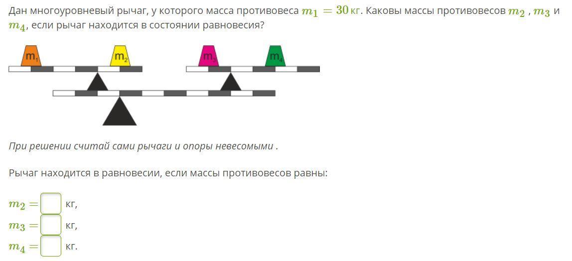 Дан многоуровневый рычаг, у которого масса противовеса m1=30кг. Каковы массы противовесов m2 , m3 и m4, если рычаг находится в состоянии равновесия?