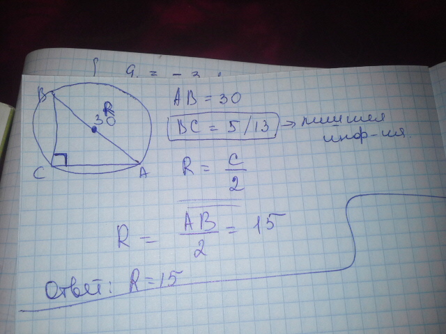 В треугольнике ABC угол C равен 90°, AB = 30, BC = 5 13 . Найдите радиус окружности, описанной около этого треугольника.