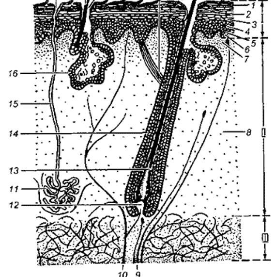 1) На рисунке (строение кожи) римская цифра II обозначает дерму