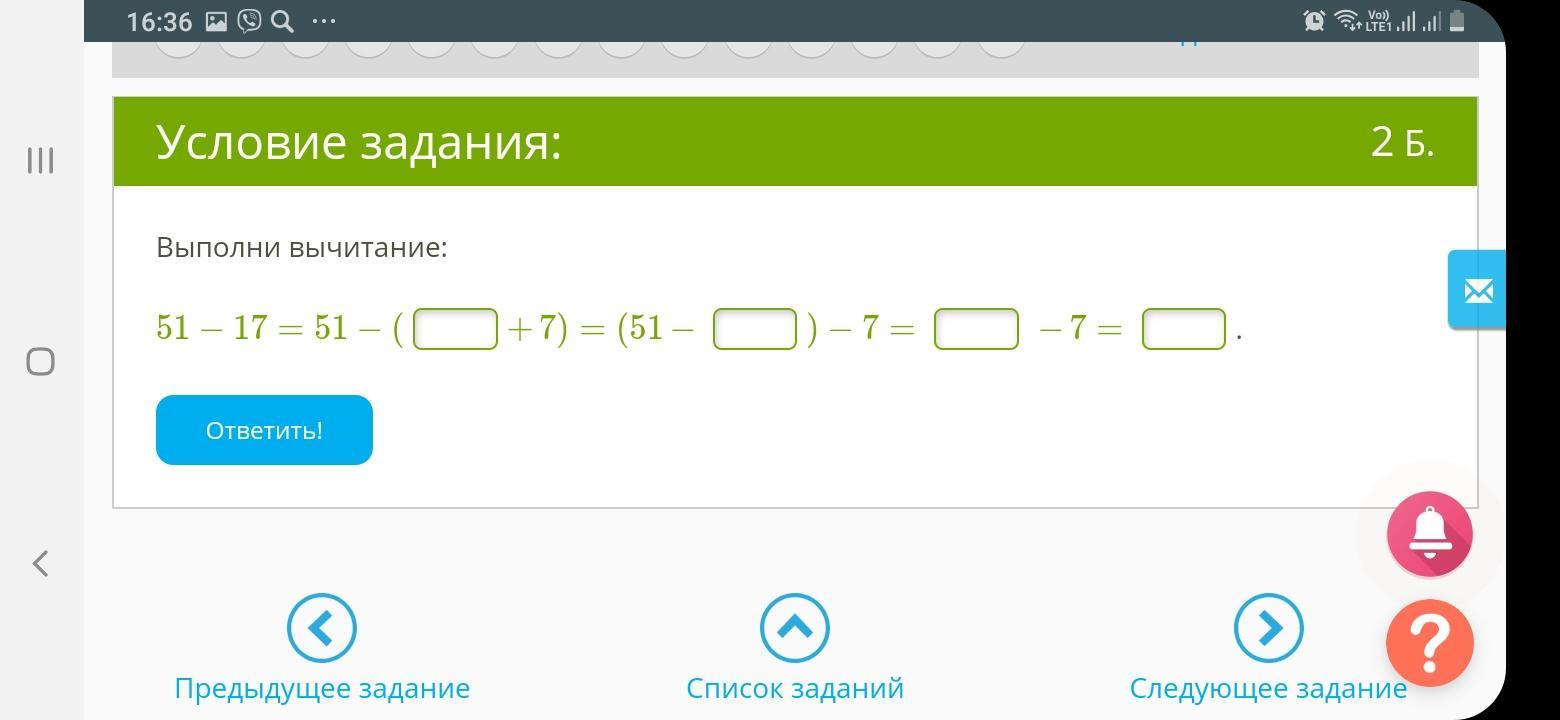 51-17 = 51-(10+7) = (51-10)-7 = 41-7 = 34