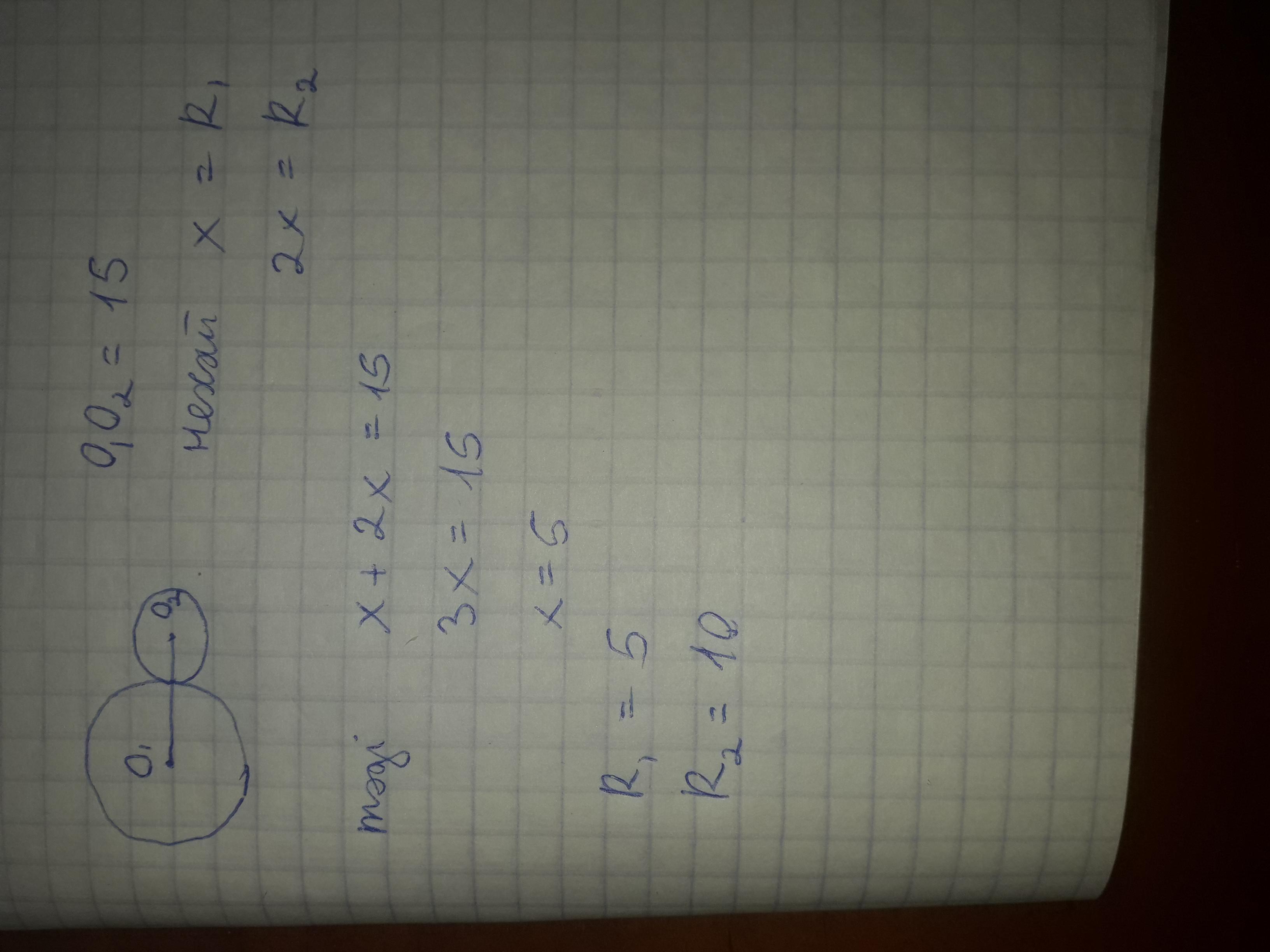 Два кола мають зовнішній дотик. Відстань між їх центрами дорівнює 15 см. Знайдіть радіуси цих кіл, якщо один з них вдвічі більший за інший.