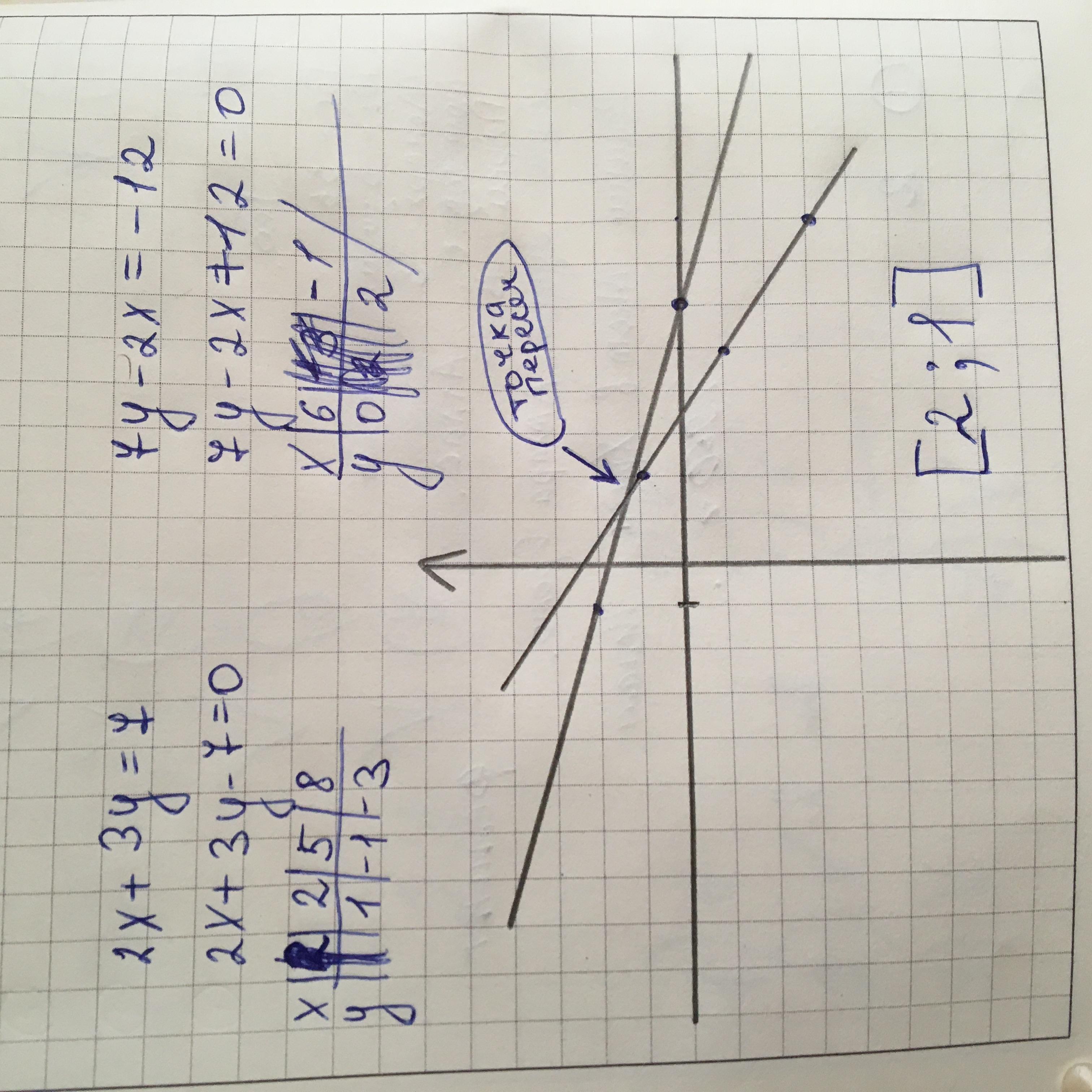 Найдите координаты точек пересечения прямых 2х + 3у = 7 и 7у – 2х = - 12.