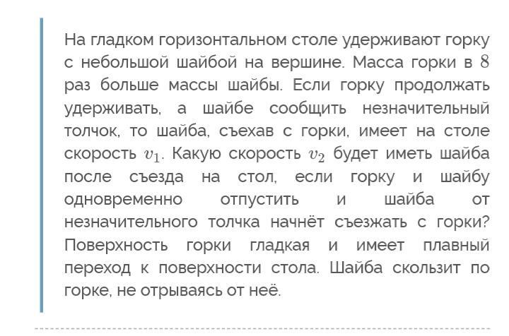 0.5*m*(v1)^2 = 0.5*m*(v2)^2 + 0.5*M*V^2, (**) (V — скорость «отдачи» горки)