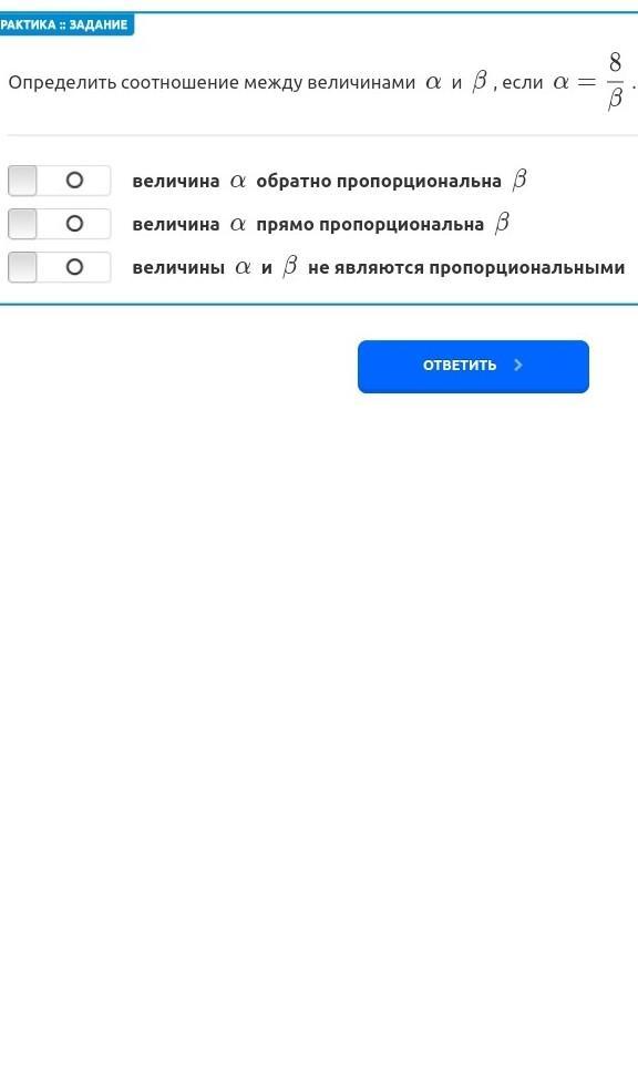 Определить соотношение между величинами a и b,если a=8/b 1)величина a обратно пропорциональна b 2)величина a прямо пропорциональна b 3)величины a и b не являются пропорциональными