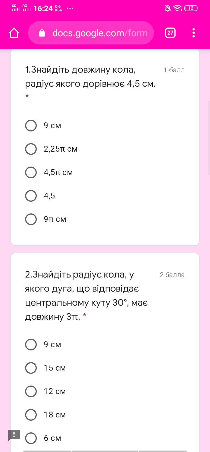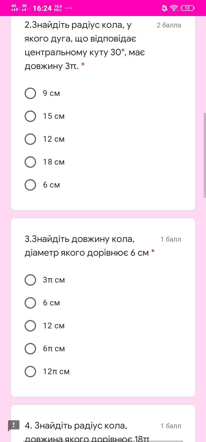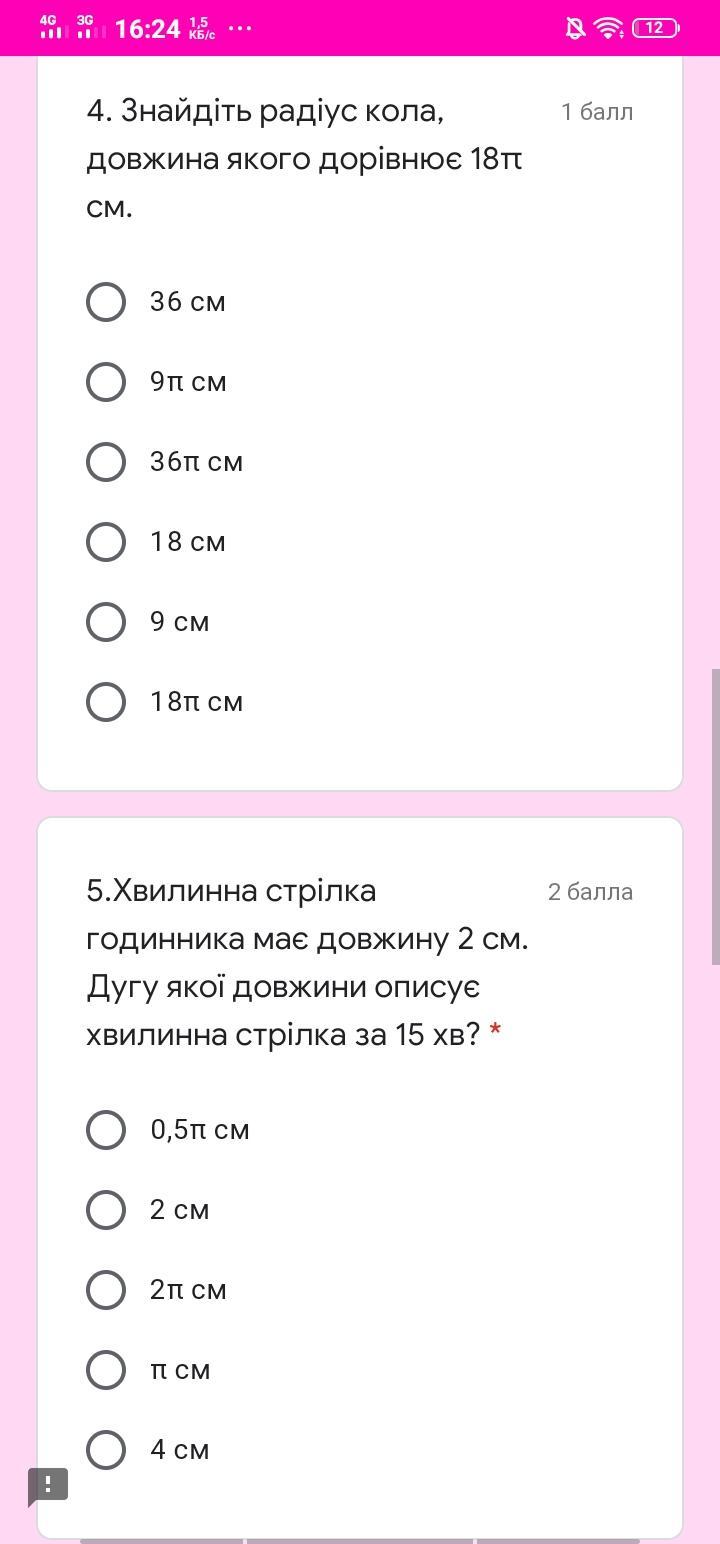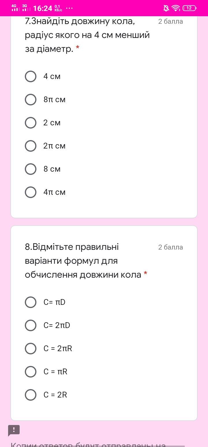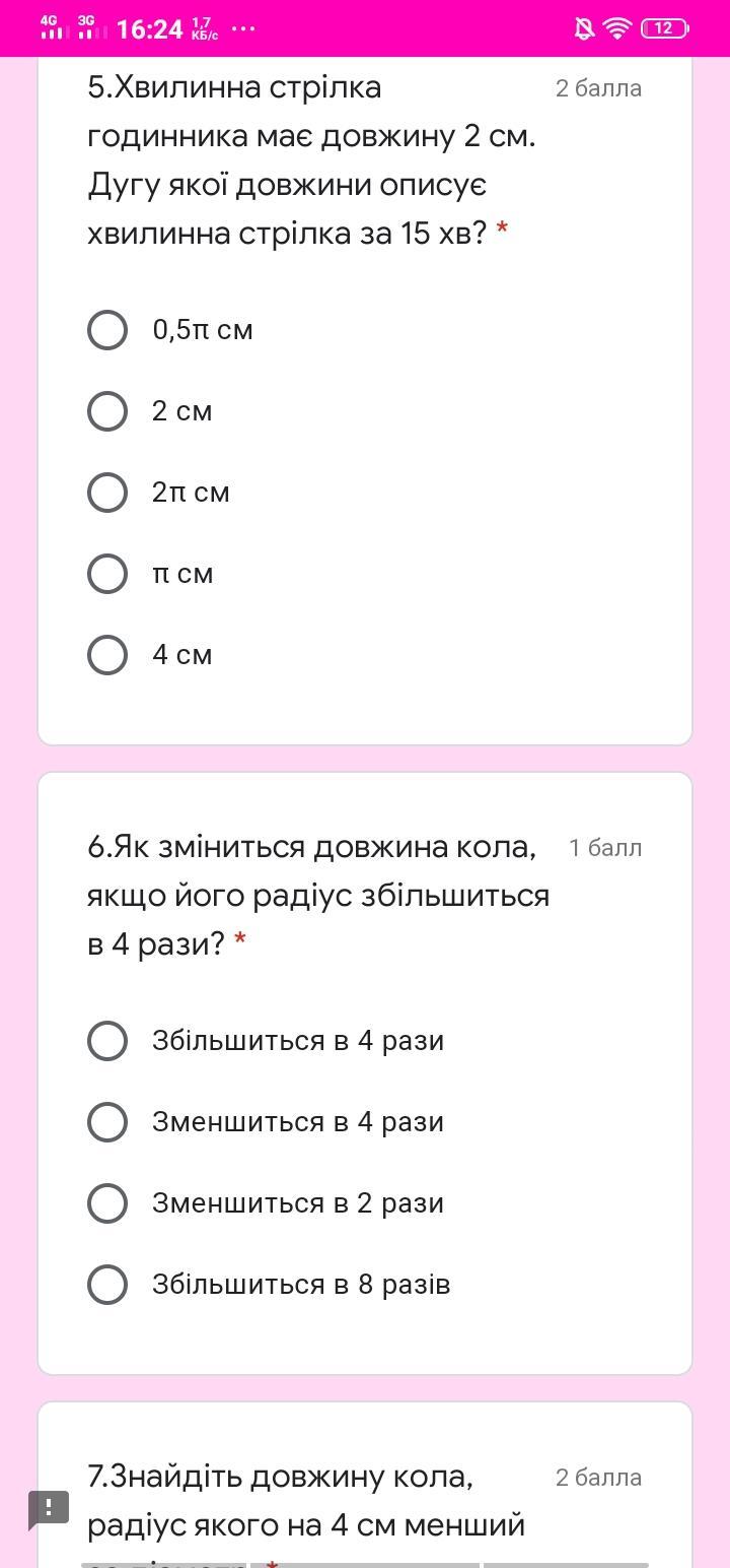 5.Хвилинна стрілка годинника має довжину 2 см. Дугу якої довжини описує хвилинна стрілка за 15 хв?6.Як зміниться довжина кола, якщо його радіус збільшиться в 4 рази? 7.Знайдіть довжину кола, радіус якого на 4 см менший за діаметр. 8.Відмітьте правильні варіанти формул для обчислення довжини кола