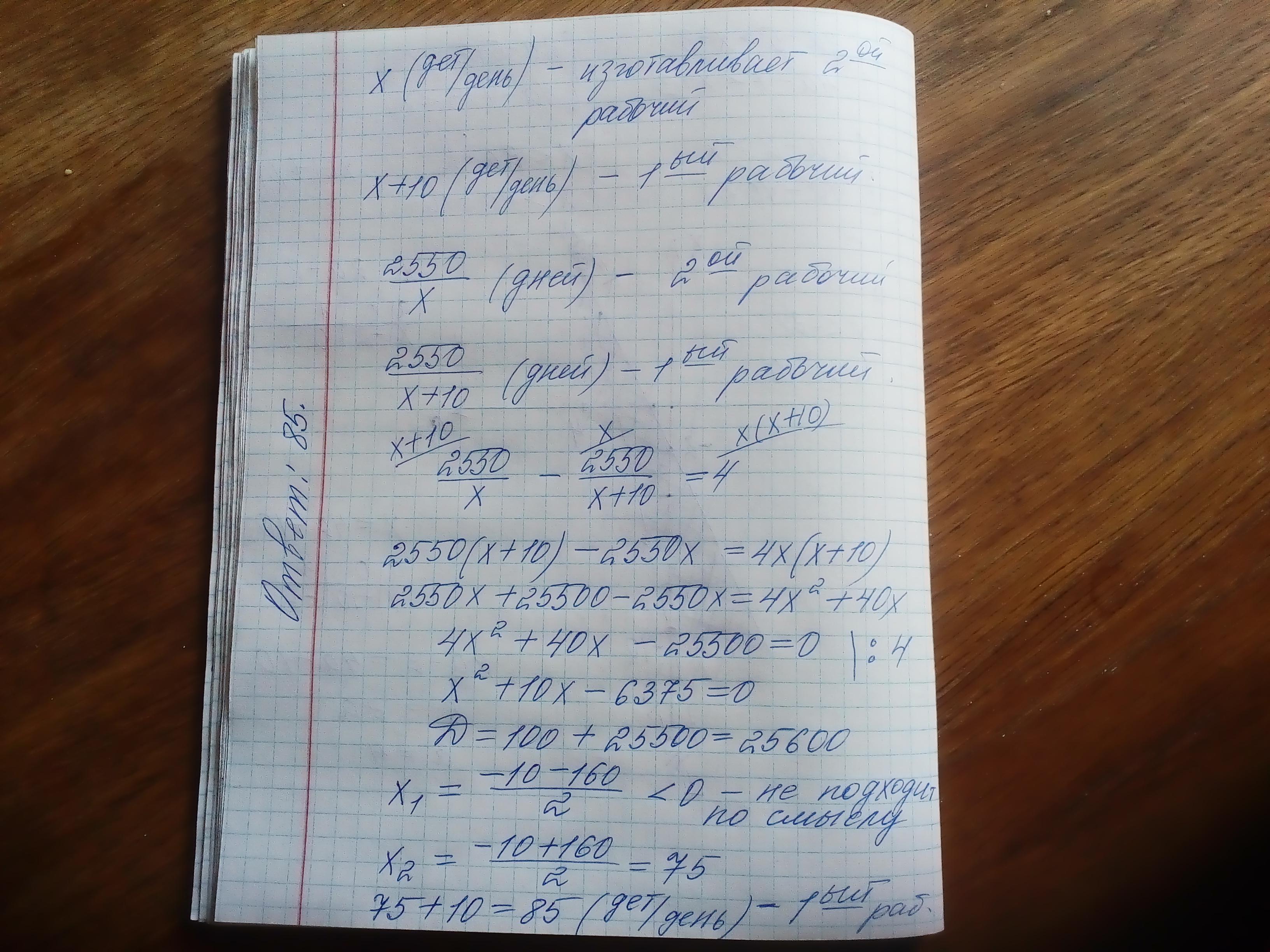 30 баллов. Задание из ОГЭ. 22.Первый рабочий может изготовить за день на 10 деталей больше, чем второй, а заказ в 2550 деталей может выполнить на 4 дня быстрее, чем второй. Сколько деталей в день изготавливает первый рабочий?
