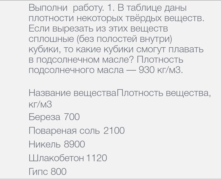 в таблице даны плотности некоторых твердых веществ если вырезать из этих веществ сплошные кубики то какие кубики смогут плавать в подсолнечном масле? плотность подсолнечного масла 930кг/м3