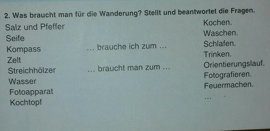4)Zelt brauche ich zum(brauche man zum) Schlafen.