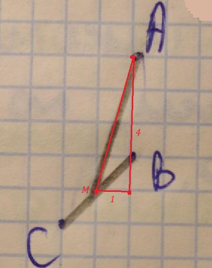 Из прямоугольного треугольника с катетами в 1 см и 4 см получаем , что расстояние от точки А до середины отрезка ВС, точки М , равно