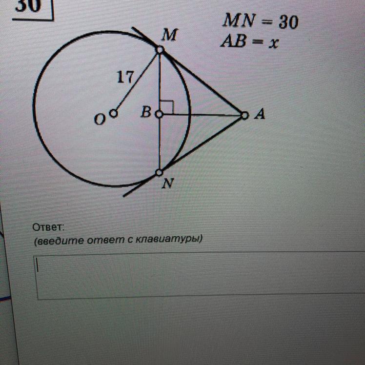 МО - радиус окружности. MN = 30, пересекаются с ОА под прямым углом. То MB = BN = 15.