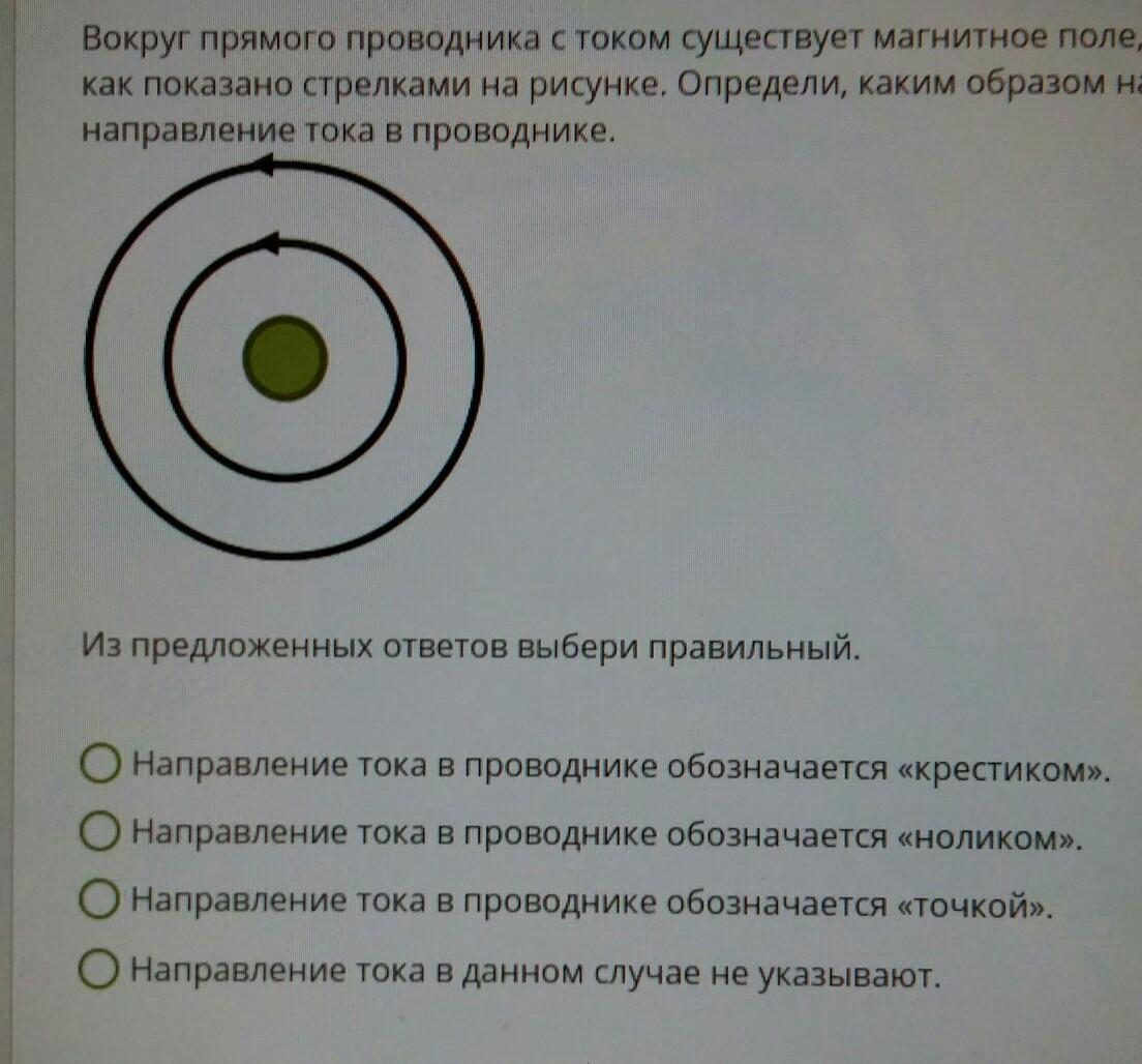 Вокруг прямого проводника с током существует магнитное поле, магнитные линии которого направлены так, как показано стрелками на рисунке. Определи, каким образом на рисунке должно быть обозначено направление тока в проводнике