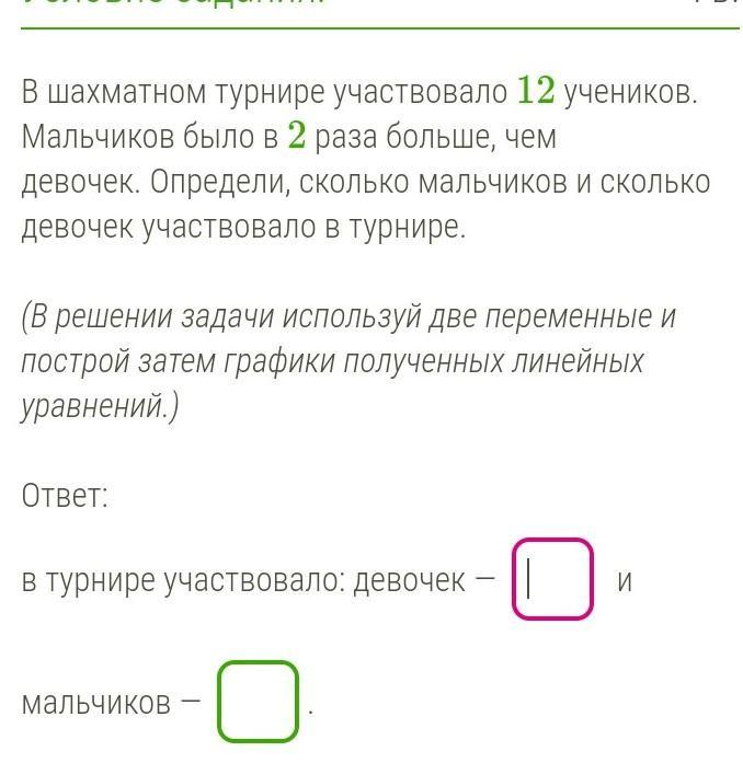 В шахматном турнире участвовало 12 учеников. Мальчиков было в 2 раза больше, чем девочек. Определи, сколько мальчиков и сколько девочек участвовало в турнире.