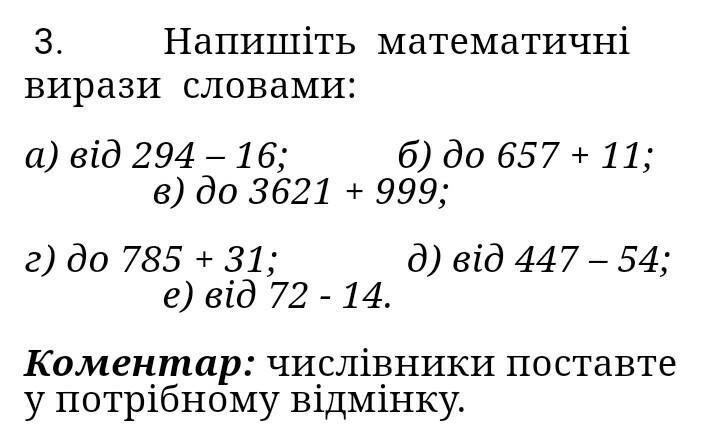 а)від двухсот дев`яносто чотирьох відняти шістнадцять;б)до шісот п`ядесяти семи додати одинадцять ;в)до трьох тисячі шісот двадцять одного додати дев`тьсот девяносто девять ;г)до сімсот вісімдесяти п`яти додати тридцять один;д)від чотирьохсот сорока семи відняти п`ядесят чотири;е)від сімдесяти двух відняти чотирнадцять.