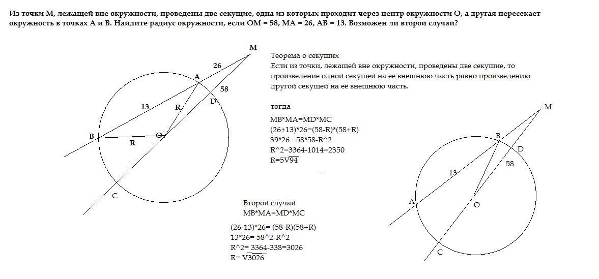 4. Из точки М, лежащей вне окружности, проведены две секущие, одна из которых проходит через центр окружности О, а другая пересекает окружность в точках А и В. Найдите радиус окружности, если ОМ = 58, МА = 26, АВ = 13. Возможен ли второй случай? С объяснением
