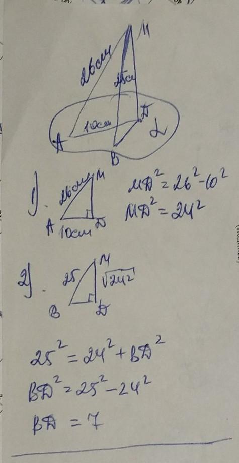З точки до прямої проведено дві похилі завдовжки 26 і 25 см. Проекція першої на пряму дорівнює 10 см. Знайдіть проекцію другої похилої на пряму.
