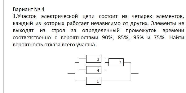 1.Участок электрической цепи состоит из четырех элементов, каждый из которых работает независимо от других. Элементы не выходят из строя за определенный промежуток времени соответственно с вероятностями 90%, 85%, 95% и 75%. Найти вероятность отказа всего участка.