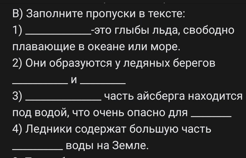 1)Айсберг-это глыба льда, свободно плавающие в океане или море.