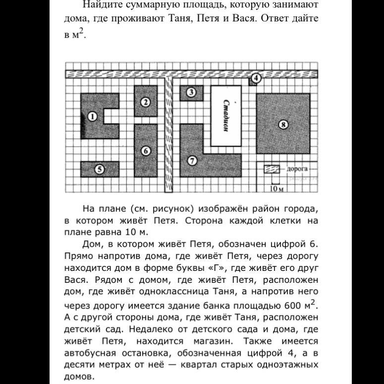 Найдите суммарную площадь, которую занимают дома, где проживают Таня, Петя и Вася. Помогите мне пожалуйста