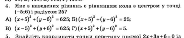 Яке з наведених рiвнянь е рiвнянням кола з центром у точцi (-5,6) i радiусом 25? Завдання 4 прикрепила ниже срочно