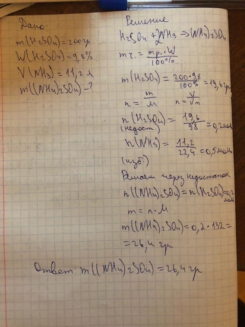 Обчисліть масу амоній сульфату, який утворюється при пропусканні через розчин сульфатної кислоти масою 200гр з масовою часткою розчиненої речовини 9,8% амоніаку об’ємом 11,2л (н.у.)