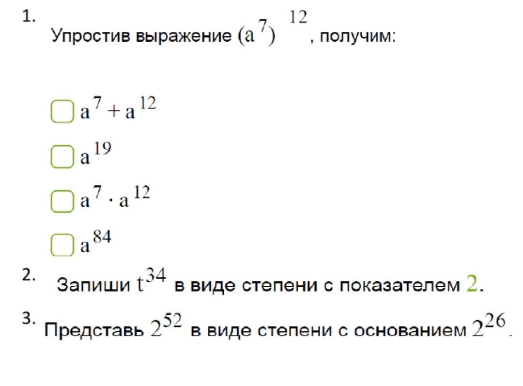 1) (a7)12 степени всегда перемножаютса если в таком положение находятса. Ответ: а^84