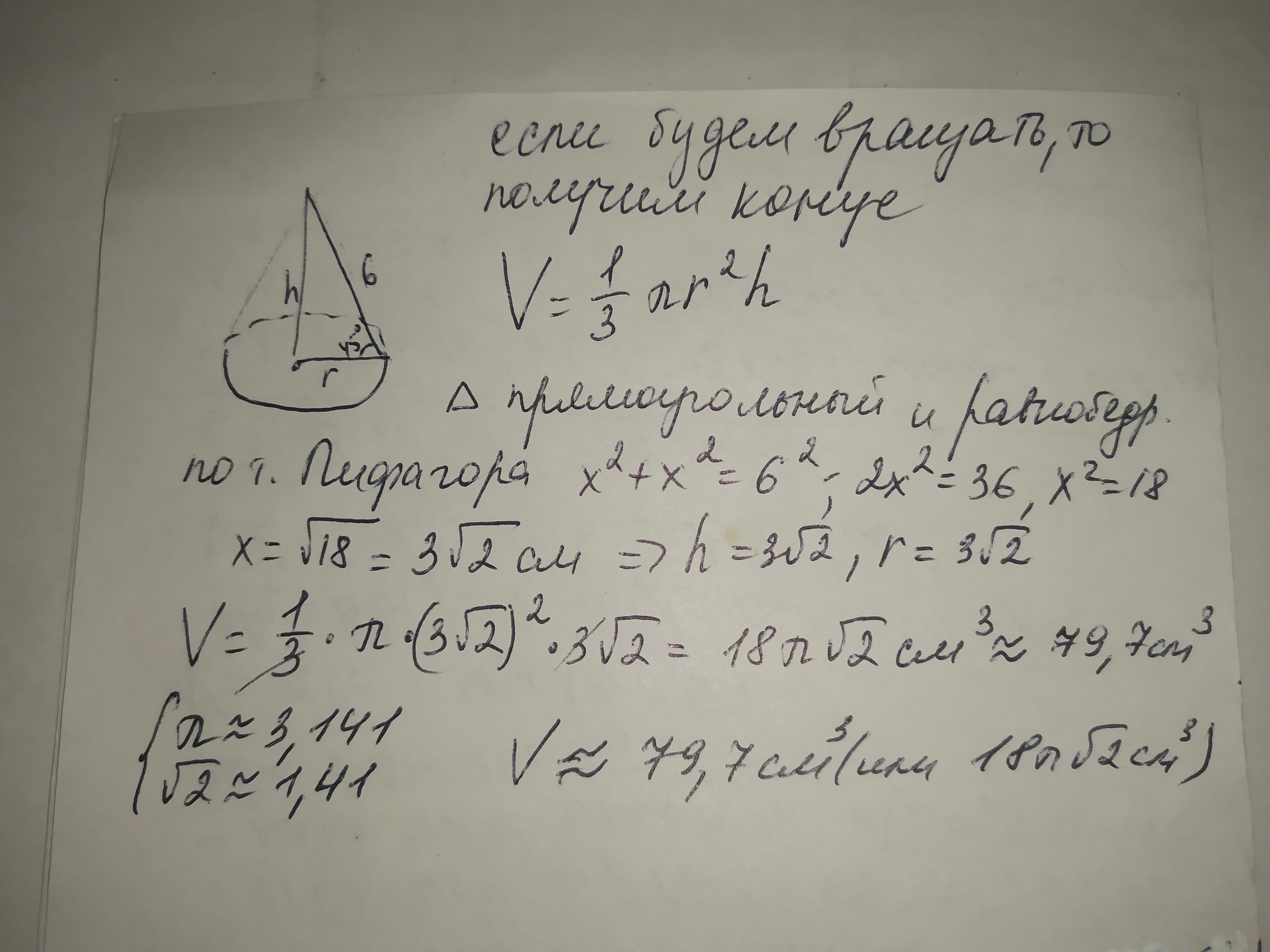 Прямоугольный треугольник, гипотенуза которого равна 6 см, а острый угол 45º , вращается вокруг катета. Найти объём полученного тела вращения.