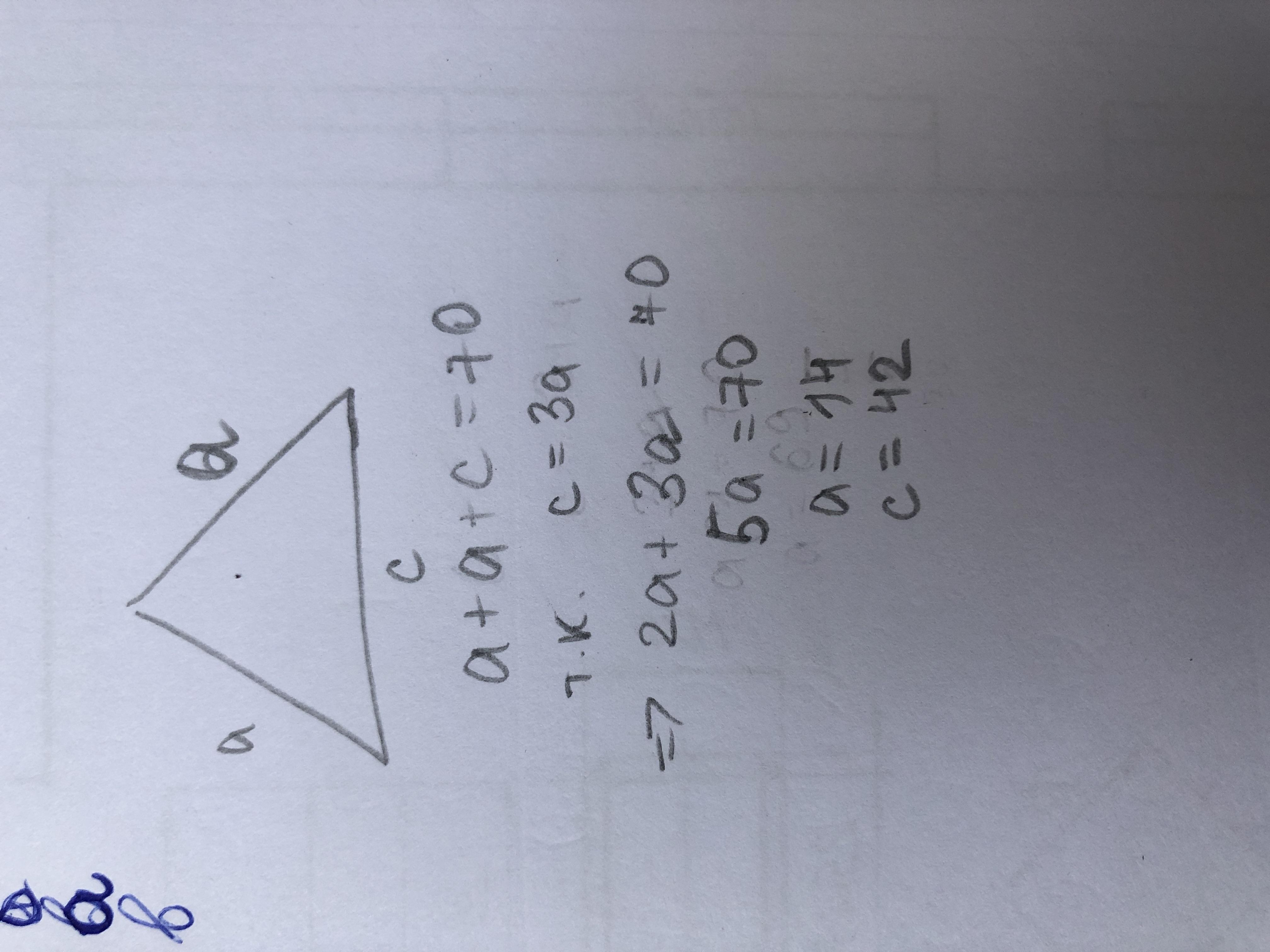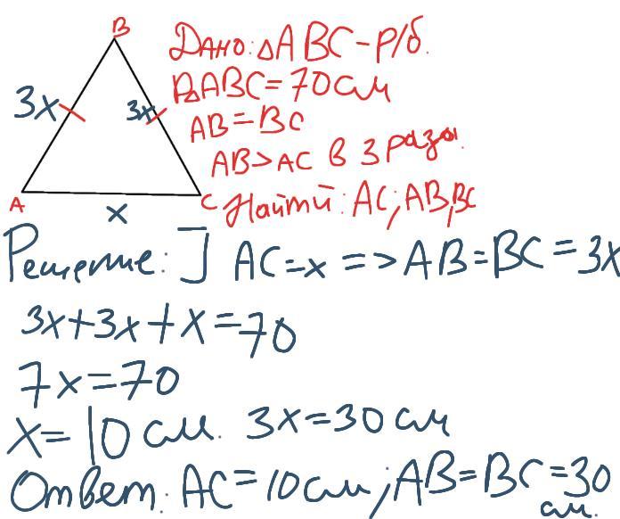 .В равнобедренном треугольнике с периметром 70 см. боковая сторона в 3 раза больше основания. Найдите стороны треугольника.